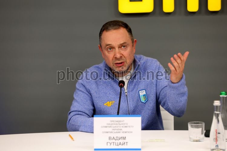 Президент Национального олимпийского комитета Украины, олимпийский чемпион Вадим Гутцайт во время пресс-конференции, посвященной развитию украинского спортивного кино, в пресс-центре УНИАН в Киеве, 19 декабря 2025 г. Прессконференция с участием Президента Национального олимпийского комитета Украины и Председателя Государственного агентства Украины по кино была посвящена развитию украинского спортивного кино и перспективам сотрудничества между спортивной и кинематографической отраслями. В ходе мероприятия участники обсудили роль спортивного кино как важного культурного продукта, который формирует национальные ценности, популяризирует спорт, демонстрирует силу характера, выносливость, взаимоподдержку и преодоление личных вызовов. Фото Ковальчук Виктор / УНИАН