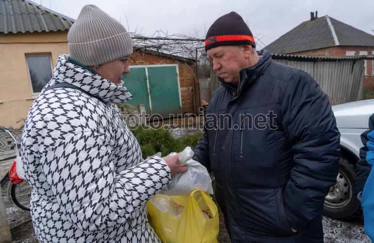 Сотрудники подразделения полиции "Білий янгол" привезли продуктовые наборы жителям одного из прифронтовых сел Золочевского района Харьковской области, 22 декабря 2025 г. В этом селе проживает несколько десятков человек, которые не могут получить продукты и предметы первой необходимости, потому что ни один магазин здесь не работает. Фото Мариенко Андрей / УНИАН