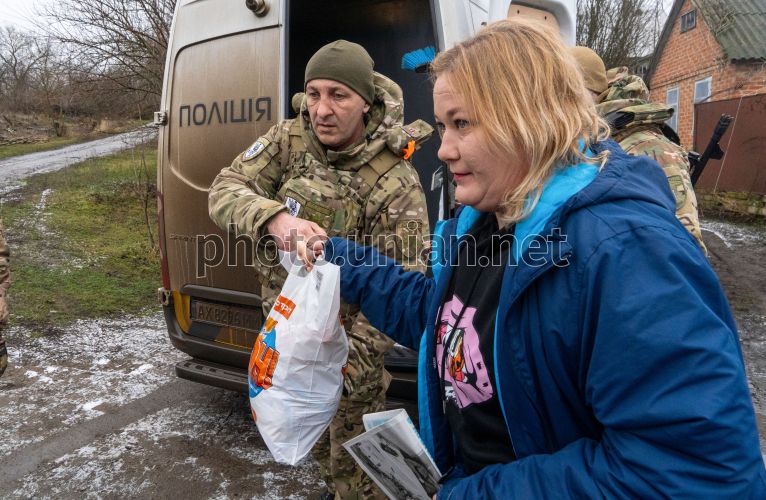 Сотрудники подразделения полиции "Білий янгол" раздают продуктовые наборы жителям одного из прифронтовых сел Золочевского района Харьковской области, 22 декабря 2025 г. В этом селе проживает несколько десятков человек, которые не могут получить продукты и предметы первой необходимости, потому что ни один магазин здесь не работает. Фото Мариенко Андрей / УНИАН