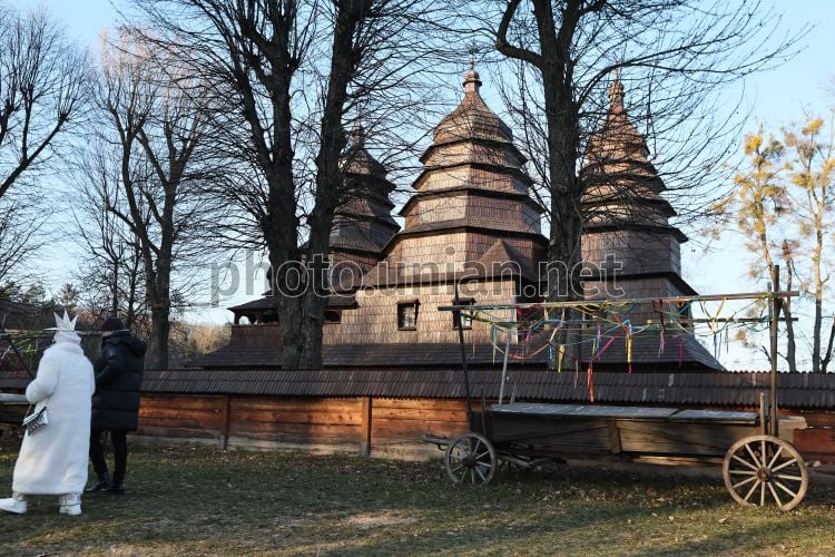 Церковь Святого Николая в скансене «Шевченковский гай» во Львове, 25 декабря 2025 г. Во львовском скансене «Шевченковский Гай» 25 декабря начался традиционный фестиваль «Рождество в Гае». Посетители музея народной архитектуры и быта имели возможность осмотреть разнообразные вертепы от любительских коллективов города и области. Гостей ждали колядники и вертепы, «живая» шопка с животными и экскурсия «Украинское Рождество». Фестиваль стартовал показом патриотического вертепа от коллектива "АвантюрА". Арт-вертеп «Авантюра» - один из победителей благотворительного сбора в поддержку 80-й отдельной десантно-штурмовой Галицкой бригады. Фото Кравс Евгений / УНИАН