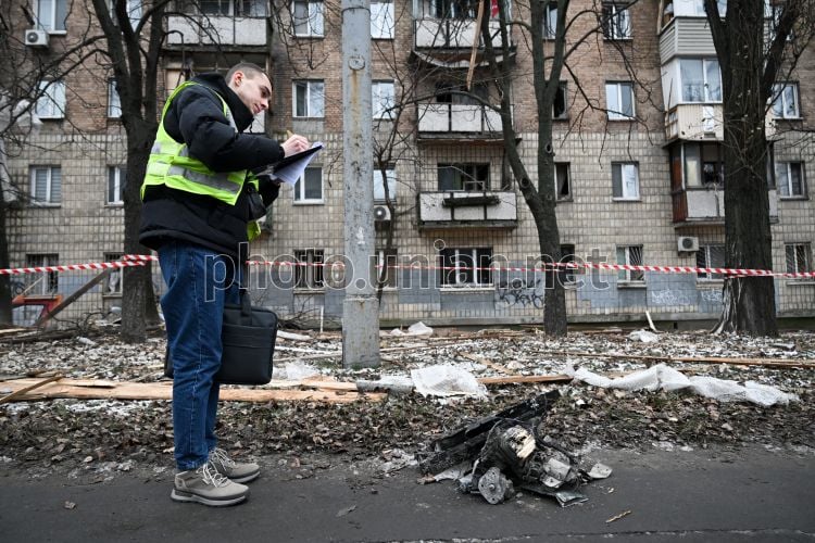 Обломки российского дрона на улице в Киеве, 27 декабря 2025 г. В ночь на 27 декабря российские войска нанесли массированный комбинированный удар по Киеву. Повреждения фиксируют в 7 районах. В нескольких районах возникли пожары в жилых домах. Известно об одном погибшем, 28 пострадавших, среди которых двое детей. Фото Ратынский Вячеслав / УНИАН