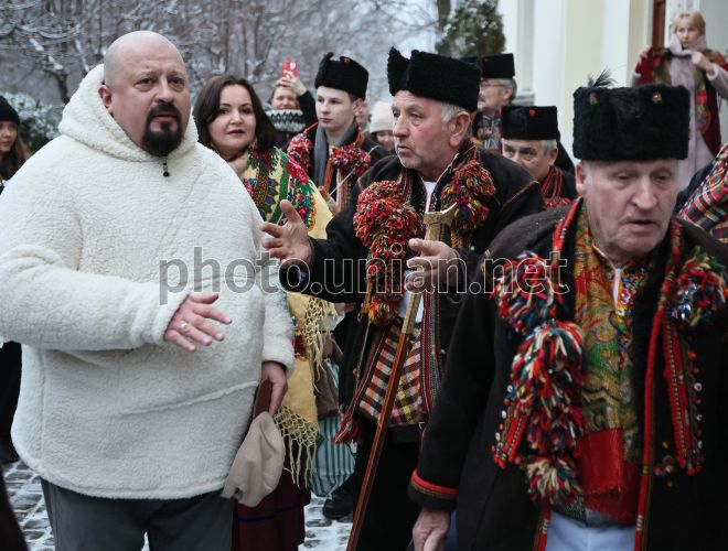 Директор Львовского национального литературно-мемориального музея Ивана Франко Богдан Тихолоз с колядниками из Криворовни, во Львове, 27 декабря 2025 г. Колядники из Криворовны посетили Дом Франко во Львове. Фото Кравс Евгений / УНИАН