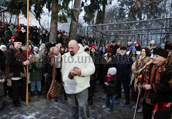 Директор Львовского национального литературно-мемориального музея Ивана Франко Богдан Тихолоз с колядниками из Криворовни, во Львове, 27 декабря 2025 г. Колядники из Криворовны посетили Дом Франко во Львове. Фото Кравс Евгений / УНИАН