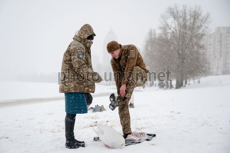 Военнослужащий готовится к крещенскому купанию в озере в парке "Наталка" в Оболонском районе города Киева, 6 января 2025 г. Фото Ратынский Вячеслав / УНИАН