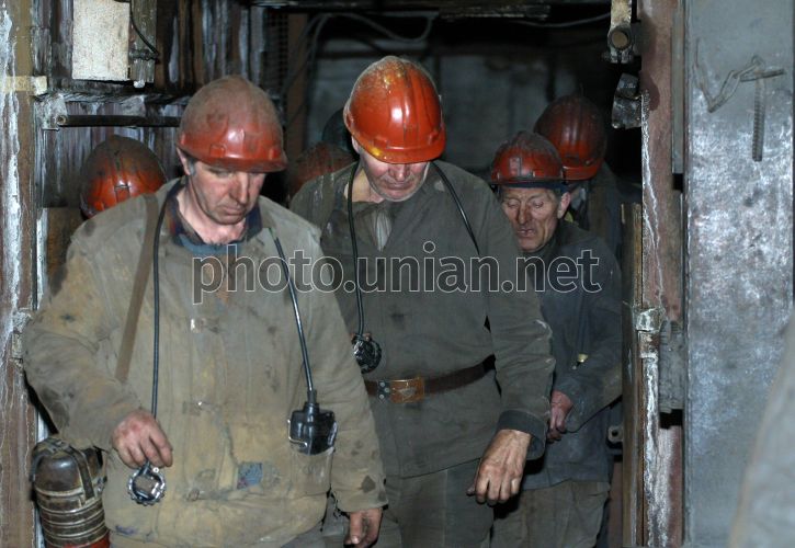 FILE Шахтеры после смены на шахте им. М.И. Калинина, в Донецке, в пятницу, 27 февраля 2004 г. Шахта им. М. И. Калинина начала свою деятельность в августе 1961 г. В 1965 г. шахта вышла на проектную мощность 1,2 млн. тонн угля в год и в течение 25 лет работала на уровне проектной мощности и выше. Максимальный уровень добычи угля по шахте достигнут в 1974г. - 1,4 млн. тонн в год, производительность труда рабочего по добыче угля при этом составила 43,6 тонн. Фото УНИАН