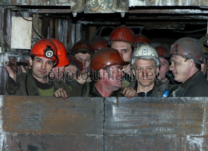 FILE Шахтеры готовятся к спуску в забой на шахте им. М.И. Калинина, в Донецке, в пятницу, 27 февраля 2004 г. Шахта им. М. И. Калинина начала свою деятельность в августе 1961 г. В 1965 г. шахта вышла на проектную мощность 1,2 млн. тонн угля в год и в течение 25 лет работала на уровне проектной мощности и выше. Максимальный уровень добычи угля по шахте достигнут в 1974г. - 1,4 млн. тонн в год, производительность труда рабочего по добыче угля при этом составила 43,6 тонн. Фото УНИАН