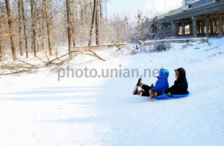 Дети съезжают на ледянке со снежной горки в Киеве, 11 января 2026 г. Фото Синица Александр / УНИАН