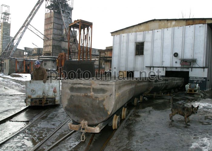 FILE Шахта им. М.И. Калинина, в Донецке, в пятницу, 27 февраля 2004 г. Шахта им. М. И. Калинина начала свою деятельность в августе 1961 г. В 1965 г. шахта вышла на проектную мощность 1,2 млн. тонн угля в год и в течение 25 лет работала на уровне проектной мощности и выше. Максимальный уровень добычи угля по шахте достигнут в 1974г. - 1,4 млн. тонн в год, производительность труда рабочего по добыче угля при этом составила 43,6 тонн. Фото УНИАН
