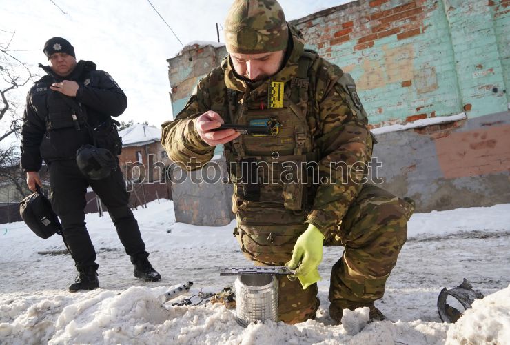 Саперы обезвреживают взрывоопасные элементы после атаки в Харькове, 19 января 2025 г. Российские войска днем 19 января снова атаковали Харьков. В результате удара трех управляемых авиабомб погиб человек, количество раненых растет, 19 января 2025 г. Фото Мариенко Андрей / УНИАН