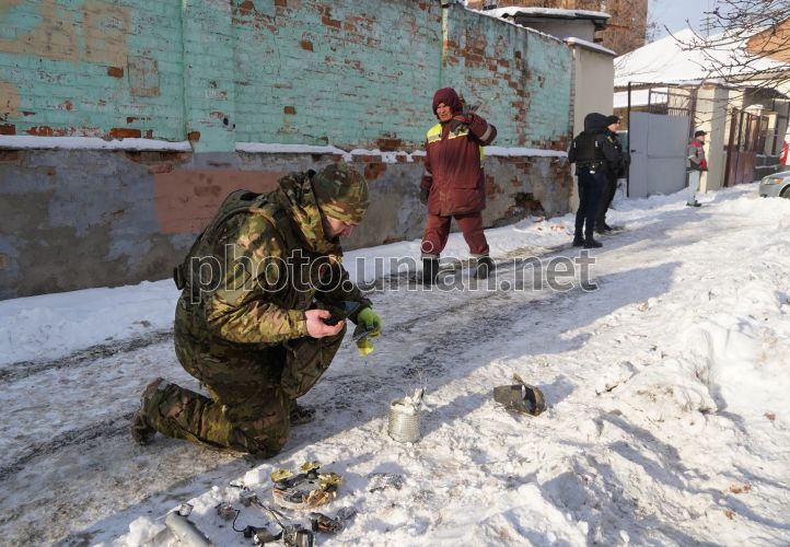 Саперы обезвреживают взрывоопасные элементы после атаки в Харькове, 19 января 2025 г. Российские войска днем 19 января снова атаковали Харьков. В результате удара трех управляемых авиабомб погиб человек, количество раненых растет, 19 января 2025 г. Фото Мариенко Андрей / УНИАН