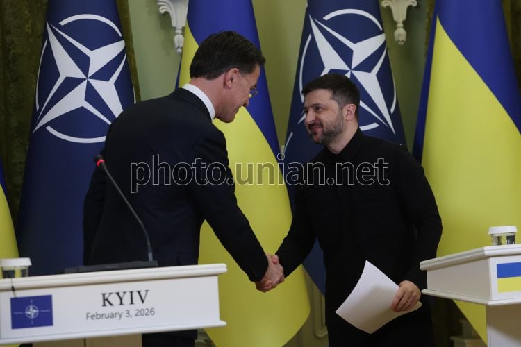 Президент Украины Владимир Зеленский и Генеральный секретарь НАТО Марк Рютте во время совместного общения с журналистами в Киеве, 3 февраля 2026 г. Фото Ковальчук Виктор / УНИАН