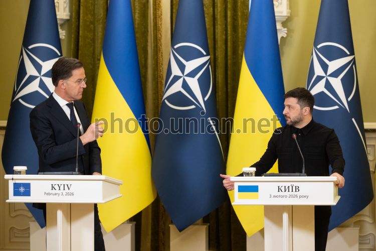 Президент Украины Владимир Зеленский и Генеральный секретарь НАТО Марк Рютте во время совместного общения с журналистами в Киеве, 3 февраля 2026 г. Фото УНИАН