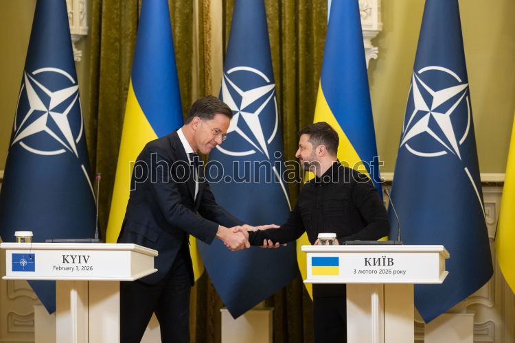 Президент Украины Владимир Зеленский и Генеральный секретарь НАТО Марк Рютте во время совместного общения с журналистами в Киеве, 3 февраля 2026 г. Фото УНИАН