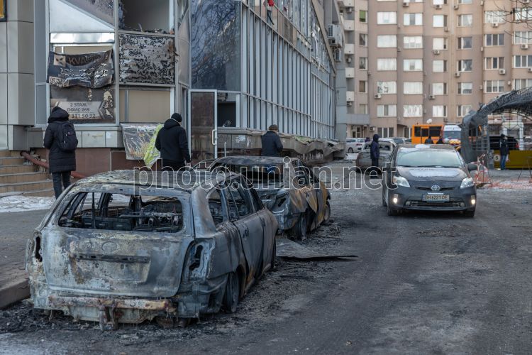 Сгоревшие автомобили в результате массированного обстрела Одессы российскими дронами, 9 февраля 2026 г. В ночь на 9 февраля оккупационная армия нанесла по Одессе массированный удар дронами, есть попадание в многоэтажный жилой комплекс, известно о погибшем. Фото Гиманов Александр / УНИАН