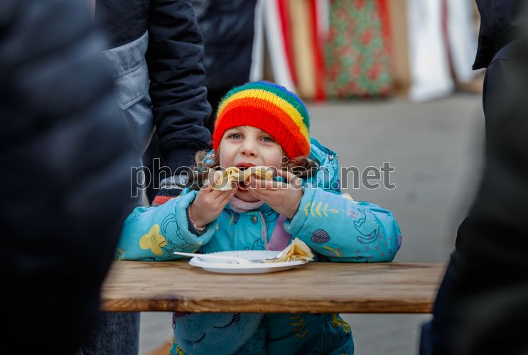 Девочка ест блины во время благотворительного гастрономического фестиваля "Ужгородская палачинта 2026", в Ужгороде, 15 февраля 2026 г. Название фестиваля происходит от венгерского слова palacsinta, которое в закарпатском диалекте означает "блин". Фестиваль организован с благотворительной целью - сбор донатов для закарпатских подразделений ВСУ, восстановление фестивального движения и традиций края, а также поддержка ветеранских бизнесов и локальных крафтовых производителей. Фото Немеш Янош / УНИАН