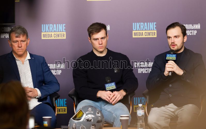 Отец и тренер Владислава Гераскевича Михаил Гераскевич, украинский скелетонист Владислав Гераскевич, адвокат Евгений Пронин (слева направо) во время пресс-конференции, в Киеве, 19 февраля 2026 г. Украинский скелетонист Владислав Гераскевич рассказал о планах бороться дальше после проигранного суда в CAS по его дисквалификации по Олимпиаде-2026. Гераскевича дисквалифицировали из Олимпиады-2026 за желание выступить в "шлеме памяти", на котором изображены погибшие украинские спортсмены. Фото Надежда Звягина / УНИАН