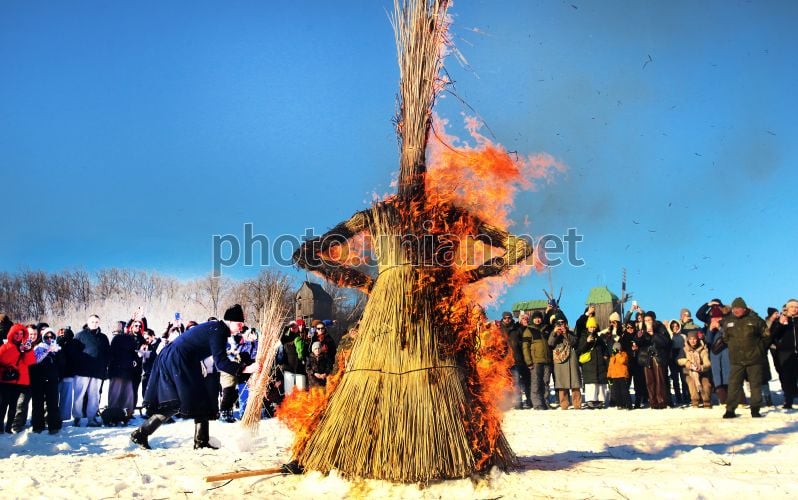 Сжигание чучела зимы во время праздника «Масленица. Колодий» в Национальном музее народной архитектуры и быта Украины, в Пирогово, 21 февраля 2026 г. Фото Синица Александр / УНИАН