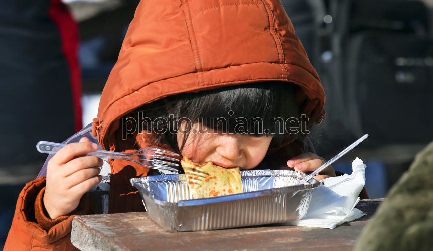 Девочка ест блины во время праздника «Масленица. Колодий» в Национальном музее народной архитектуры и быта Украины, в Пирогово, 21 февраля 2026 г. Фото Синица Александр / УНИАН