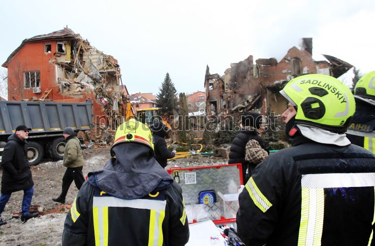 Спасатели во время аварийно-спасательных работ возле разрушенных в результате ракетной атаки жилых домов в с. Софиевская Борщаговка (Бучанский район Киевской области), 22 февраля 2026 г. В ночь на 22 февраля российские войска совершили очередную массированную комбинированную атаку на Украину. В результате российской атаки зафиксированы разрушения и пожары в Обуховском, Броварском, Бориспольском, Бучанском и Фастовском районах области. Повреждения получили жилые дома на Софиевской Борщаговке. Фото Синица Александр / УНИАН