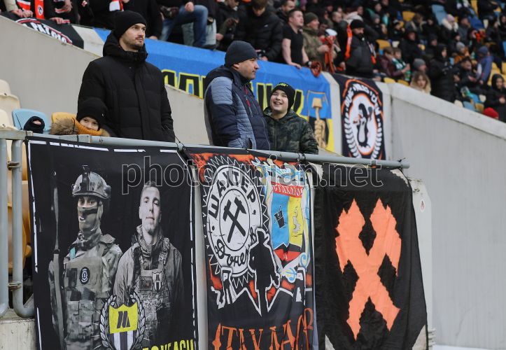Баннеры на трибуне стадиона во время матча 17-го тура Чемпионата Украины среди команд УПЛ (Премьер-лига) по футболу между ФК "Шахтер" (Донецк) и ФК "Карпаты" (Львов) во Львове, 22 февраля 2026 г. Матч закончился со счетом 3:0 в пользу ФК "Шахтер" (Донецк). Фото Кравс Евгений / УНИАН