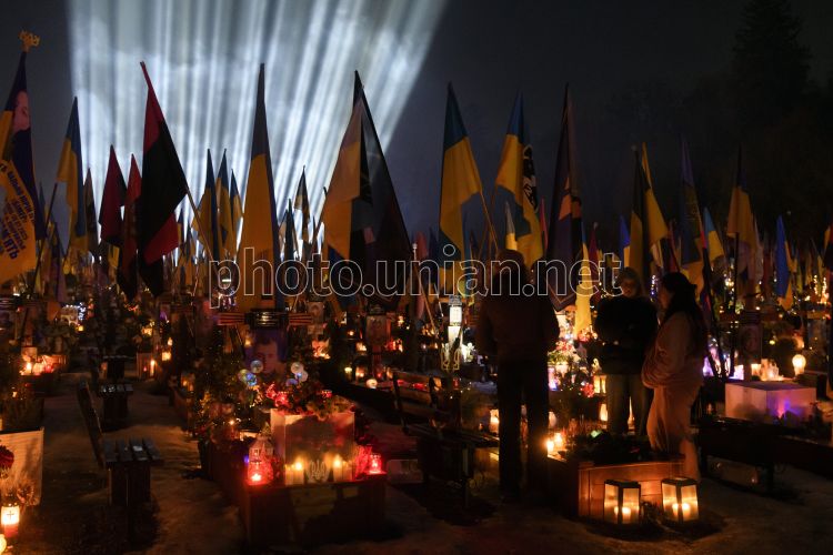 Символические "Лучи памяти" над могилами павших защитников во Львове, 23 февраля 2026 г. Во Львове в канун четвертой годовщины полномасштабного вторжения РФ над могилами павших украинских Защитников и Защитниц зажгли "Лучи памяти". Этот свет символизирует боль, скорбь, память и благодарность воинам. Фото Тыс Николай / УНИАН