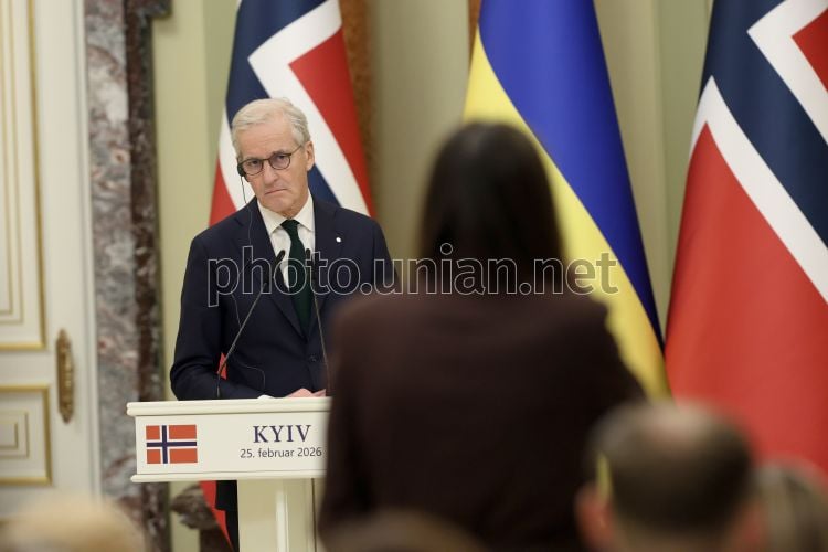 Премьер-министр Королевства Норвегия Йонас Гар Стере во время совместной с Президентом Украины Владимиром Зеленским встречи с представителями медиа, в Киеве, 25 февраля 2026 г. Президент Владимир Зеленский провел встречу с премьер-министром Норвегии Йонасом Гаром Стере. Основным фокусом переговоров стало укрепление энергетической безопасности и переход к долгосрочному стратегическому партнерству. Фото Ковальчук Виктор / УНИАН