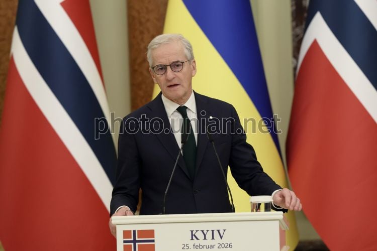 Премьер-министр Королевства Норвегия Йонас Гар Стере во время совместной с Президентом Украины Владимиром Зеленским встречи с представителями медиа, в Киеве, 25 февраля 2026 г. Президент Владимир Зеленский провел встречу с премьер-министром Норвегии Йонасом Гаром Стере. Основным фокусом переговоров стало укрепление энергетической безопасности и переход к долгосрочному стратегическому партнерству. Фото Ковальчук Виктор / УНИАН