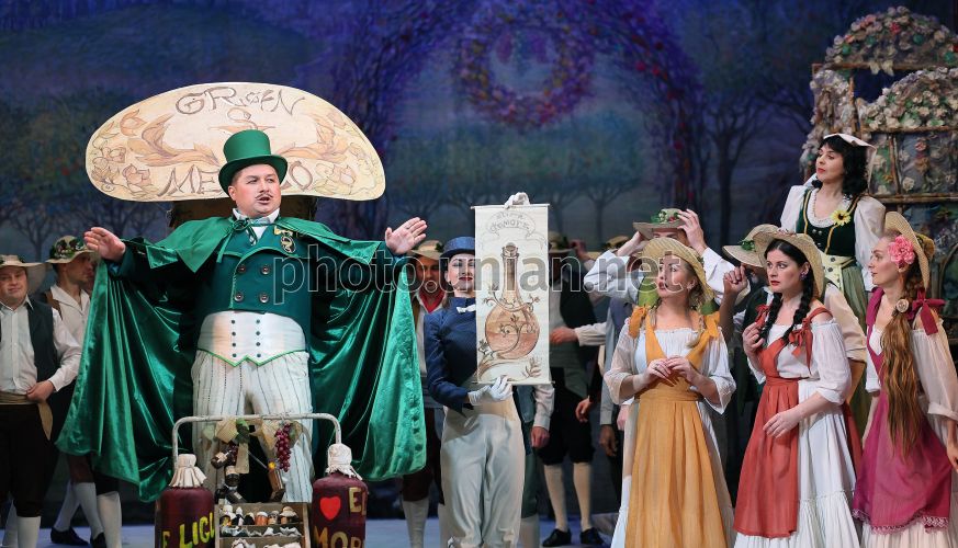 Комическая опера «Любовный напиток» на сцене Львовской национальной оперы, во Львове, 1 марта 2026 г. «Любовный напиток» (итал. L'elisir d'amore) — лирико-комическая операиталий Феличе Романи. Это трогательная история любви и веселая, жизнерадостная комедия с замечательной музыкой, благодаря чему эта опера стала одним из самых популярных представлений всех времен. Исполняется на итальянском языке с украинскими субтитрами. В главных партиях Алина Диденко (Адина), заслуженный артист Украины Олег Садецкий (Неморино), Наталья Степаняк (Джанетта), Алексей Ветров (Белькоре), Дмитрий Кокотко (Дулькамара). Фото Кравс Евгений / УНИАН