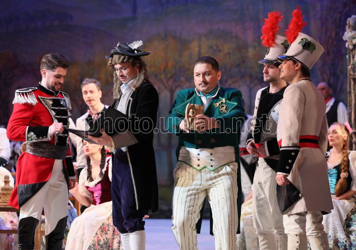 Комическая опера «Любовный напиток» на сцене Львовской национальной оперы, во Львове, 1 марта 2026 г. «Любовный напиток» (итал. L'elisir d'amore) — лирико-комическая операиталий Феличе Романи. Это трогательная история любви и веселая, жизнерадостная комедия с замечательной музыкой, благодаря чему эта опера стала одним из самых популярных представлений всех времен. Исполняется на итальянском языке с украинскими субтитрами. В главных партиях Алина Диденко (Адина), заслуженный артист Украины Олег Садецкий (Неморино), Наталья Степаняк (Джанетта), Алексей Ветров (Белькоре), Дмитрий Кокотко (Дулькамара). Фото Кравс Евгений / УНИАН