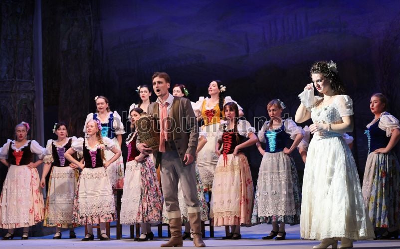 Комическая опера «Любовный напиток» на сцене Львовской национальной оперы, во Львове, 1 марта 2026 г. «Любовный напиток» (итал. L'elisir d'amore) — лирико-комическая операиталий Феличе Романи. Это трогательная история любви и веселая, жизнерадостная комедия с замечательной музыкой, благодаря чему эта опера стала одним из самых популярных представлений всех времен. Исполняется на итальянском языке с украинскими субтитрами. В главных партиях Алина Диденко (Адина), заслуженный артист Украины Олег Садецкий (Неморино), Наталья Степаняк (Джанетта), Алексей Ветров (Белькоре), Дмитрий Кокотко (Дулькамара). Фото Кравс Евгений / УНИАН