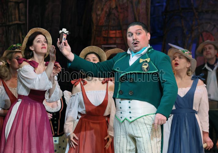 Оперный певец Дмитрий Кокотко (Дулькамара) во время комической оперы «Любовный напиток» на сцене Львовской национальной оперы, во Львове, 1 марта 2026 г. «Любовный напиток» (итал. L'elisir d'amore) — лирико-комическая операиталий Феличе Романи. Это трогательная история любви и веселая, жизнерадостная комедия с замечательной музыкой, благодаря чему эта опера стала одним из самых популярных представлений всех времен. Исполняется на итальянском языке с украинскими субтитрами. В главных партиях Алина Диденко (Адина), заслуженный артист Украины Олег Садецкий (Неморино), Наталья Степаняк (Джанетта), Алексей Ветров (Белькоре), Дмитрий Кокотко (Дулькамара). Фото Кравс Евгений / УНИАН