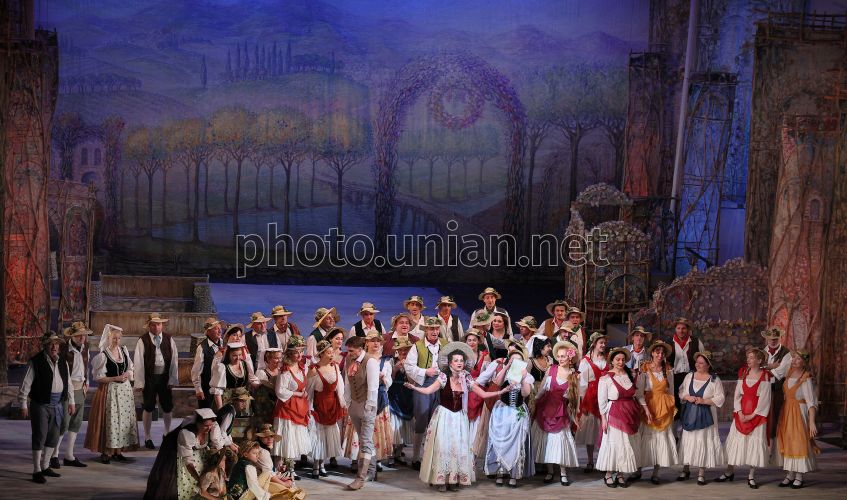 Комическая опера «Любовный напиток» на сцене Львовской национальной оперы, во Львове, 1 марта 2026 г. «Любовный напиток» (итал. L'elisir d'amore) — лирико-комическая операиталий Феличе Романи. Это трогательная история любви и веселая, жизнерадостная комедия с замечательной музыкой, благодаря чему эта опера стала одним из самых популярных представлений всех времен. Исполняется на итальянском языке с украинскими субтитрами. В главных партиях Алина Диденко (Адина), заслуженный артист Украины Олег Садецкий (Неморино), Наталья Степаняк (Джанетта), Алексей Ветров (Белькоре), Дмитрий Кокотко (Дулькамара). Фото Кравс Евгений / УНИАН
