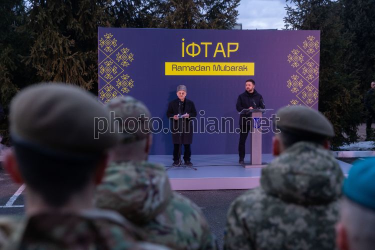 Политический и общественный деятель Украины крымскотатарского происхождения, Герой Украины, народный депутат Мустафа Джемилев и президент Украины Владимир Зеленский во время посещения Ифтара в Киеве, 2 марта 2026 года. Во время посещения Ифтара (ужин после захода солнца во время Рамадана) Владимир Зеленский наградил защитников-мусульман, которые служат в ВСУ и Национальной полиции, орденом князя Ярослава Мудрого V степени, орденом Богдана Хмельницкого III степени, орденом «За мужество» III степени Украине» и медалью «Защитнику Отчизны». 18 февраля 2026 для мусульман начался Рамадан 2026, он завершится 20 марта празднованием Ураза-байрам. Фото УНИАН