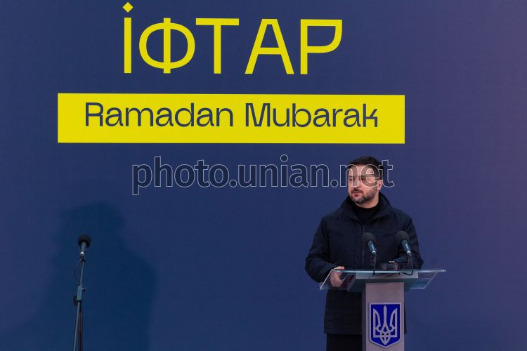 Президент Украины Владимир Зеленский выступает во время посещения Ифтара в Киеве, 2 марта 2026 года. Во время посещения Ифтара (ужин после захода солнца во время Рамадана) Владимир Зеленский наградил защитников-мусульман, которые служат в ВСУ и Национальной полиции, орденом князя Ярослава Мудрого V степени, орденом Богдана Хмельницкого III степени, орденом «За мужество» III степени Украине» и медалью «Защитнику Отчизны». 18 февраля 2026 для мусульман начался Рамадан 2026, он завершится 20 марта празднованием Ураза-байрам. Фото УНИАН