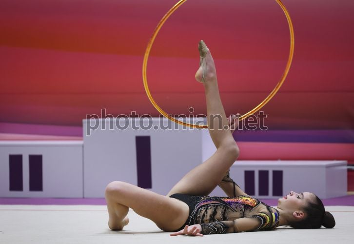 Участница XII Всеукраинского турнира по художественной гимнастике «Престиж-2026» в городе Винники, 7 марта 2026 г. В течение выходных спортивный зал «Эмели резорт» стал местом проведения 12-го Всеукраинского турнира по художественной гимнастике «Престиж-2026». В соревнованиях приняли участие юные гимнастки из разных уголков Украины. Хорошо декорированный зал, великолепные выступления спортсменок, фантастические костюмы (тренд этого года – максимум блестящих паеток). Фото Кравс Евгений / УНИАН