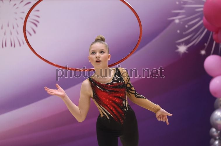 Участница XII Всеукраинского турнира по художественной гимнастике «Престиж-2026» в городе Винники, 7 марта 2026 г. В течение выходных спортивный зал «Эмели резорт» стал местом проведения 12-го Всеукраинского турнира по художественной гимнастике «Престиж-2026». В соревнованиях приняли участие юные гимнастки из разных уголков Украины. Хорошо декорированный зал, великолепные выступления спортсменок, фантастические костюмы (тренд этого года – максимум блестящих паеток). Фото Кравс Евгений / УНИАН