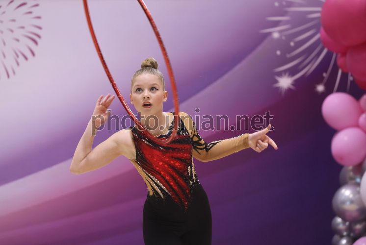 Участница XII Всеукраинского турнира по художественной гимнастике «Престиж-2026» в городе Винники, 7 марта 2026 г. В течение выходных спортивный зал «Эмели резорт» стал местом проведения 12-го Всеукраинского турнира по художественной гимнастике «Престиж-2026». В соревнованиях приняли участие юные гимнастки из разных уголков Украины. Хорошо декорированный зал, великолепные выступления спортсменок, фантастические костюмы (тренд этого года – максимум блестящих паеток). Фото Кравс Евгений / УНИАН