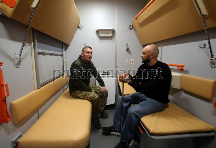 Ветераны Сергей Мамзин (72 бригада) и Александр Баталов (401 отдельный стрелковый батальон), которых после тяжелых ранений вывозили в тыловые госпитали в медицинских вагонах, во время презентации вагонов "Укрзалізниці", с помощью которых эвакуируют раненых украинцев, на перроне Центрального железнодорожного вокзала, в Киеве, 12 марта 2026 года. Сегодня четвертая годовщина с тех пор, как в рейс отправились первые медицинские вагоны, созданные "Укрзалізницею". Фото Синица Александр / УНИАН