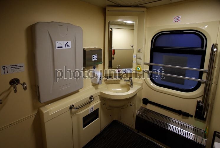 Санузел во время презентации медицинских вагонов "Укрзалізниці", с помощью которых эвакуируют раненых украинцев, на перроне Центрального железнодорожного вокзала, в Киеве, 12 марта 2026 года. Сегодня четвертая годовщина с тех пор, как в рейс отправились первые медицинские вагоны, созданные "Укрзалізницею". Фото Синица Александр / УНИАН