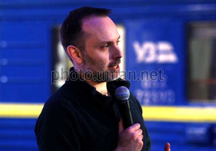 Председатель правления АО "Укрзалізниця" Александр Перцовский во время презентации медицинских вагонов "Укрзалізниці", с помощью которых эвакуируют раненых украинцев, на перроне Центрального железнодорожного вокзала, в Киеве, 12 марта 2026 года. Сегодня четвертая годовщина с тех пор, как в рейс отправились первые медицинские вагоны, созданные "Укрзалізницею". Фото Синица Александр / УНИАН