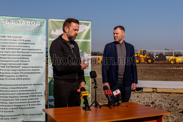 Заместитель руководителя офиса Президента Украины Виктор Микита и заместитель Министра экономики, окружающей среды и сельского хозяйства Виталий Кондратов отвечают на вопросы журналистов после церемонии закладки капсулы под строительство нового предприятия по переработке и изготовлению продукции из базальта, Закарпатская область, 13 марта 2026 г. В этот день на Закарпатье начало строительство предприятия ООО "БФ ЗАВОД" по переработке и изготовлению продукции из базальта. Завод площадью более 37 тыс. кв. м с современным оборудованием и инновационными технологиями позволит обеспечить более 120 гарантированных рабочих мест с высокой заработной платой. Фото Немеш Янош / УНИАН