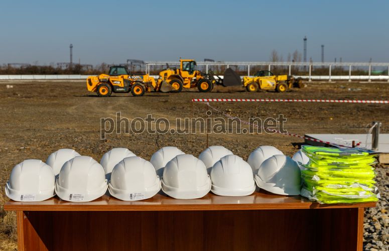 Защитные каски на столе на фоне строительной техники на территории предприятия ООО "БФ ЗАВОД", Закарпатская область, 13 марта 2026 г. В этот день на Закарпатье начало строительство предприятия ООО "БФ ЗАВОД" по переработке и изготовлению продукции из базальта. Завод площадью более 37 тыс. кв. м с современным оборудованием и инновационными технологиями позволит обеспечить более 120 гарантированных рабочих мест с высокой заработной платой. Фото Немеш Янош / УНИАН