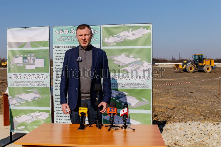 Заместитель Министра экономики, окружающей среды и сельского хозяйства Виталий Кондратов отвечает на вопросы журналистов после церемонии закладывания капсулы под строительство нового предприятия по переработке и изготовлению продукции из базальта, Закарпатская область, 13 марта 2026 г. В этот день на Закарпатье начало строительство предприятия ООО "БФ ЗАВОД" по переработке и изготовлению продукции из базальта. Завод площадью более 37 тыс. кв. м с современным оборудованием и инновационными технологиями позволит обеспечить более 120 гарантированных рабочих мест с высокой заработной платой. Фото Немеш Янош / УНИАН