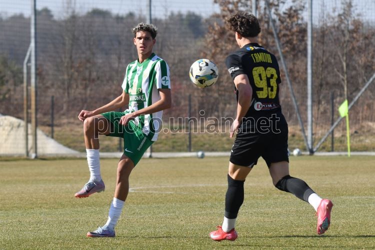 Игровой момент контрольного матча между ФК "Карпаты" (Львов) и ФК "Буковина" (Черновцы) в селе Бартатов (Львовская область), 14 марта 2026 г. Матч закончился со счетом 3:1 в пользу ФК "Карпаты" (Львов). Фото Тыс Николай / УНИАН