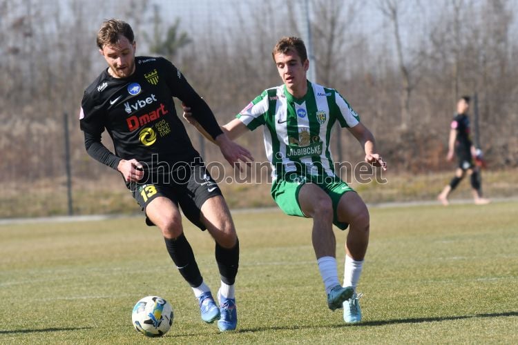 Игровой момент контрольного матча между ФК "Карпаты" (Львов) и ФК "Буковина" (Черновцы) в селе Бартатов (Львовская область), 14 марта 2026 г. Матч закончился со счетом 3:1 в пользу ФК "Карпаты" (Львов). Фото Тыс Николай / УНИАН