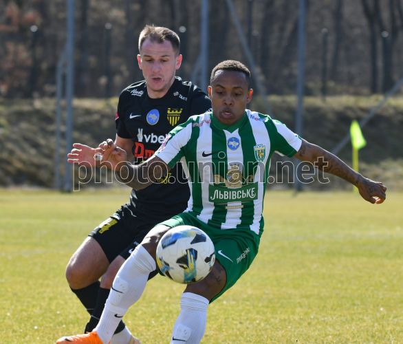 Игровой момент контрольного матча между ФК "Карпаты" (Львов) и ФК "Буковина" (Черновцы) в селе Бартатов (Львовская область), 14 марта 2026 г. Матч закончился со счетом 3:1 в пользу ФК "Карпаты" (Львов). Фото Тыс Николай / УНИАН