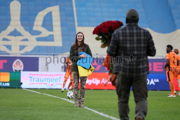 Боевой медик Элина Мединина получила предложение от жениха, с которым они вместе преодолели тяжелые испытания во время обороны Мариуполя, на «Азовстале» и в плену врага, перед началом матча 20-го тура Чемпионата Украины среди команд УПЛ (Премьер-лига) по футболу (сезон 2025/26) между ФК "Шахтер" (Донецк) и ФК "Металлист 1925" (Харьков), во Львове, 15 марта 2026 г. Матч закончился со счетом 1:0 в пользу ФК "Шахтер". Фото Кравс Евгений / УНИАН