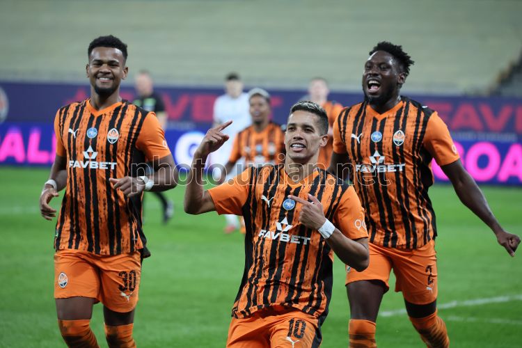 Игроки ФК "Шахтер" радуются забитому голу во время матча 20-го тура Чемпионата Украины среди команд УПЛ (Премьер-лига) по футболу (сезон 2025/26) между ФК "Шахтер" (Донецк) и ФК "Металлист 1925" (Харьков), во Львове, 15 марта 2026 г. Матч закончился со счетом 1:0 в пользу ФК "Шахтер". Фото Кравс Евгений / УНИАН