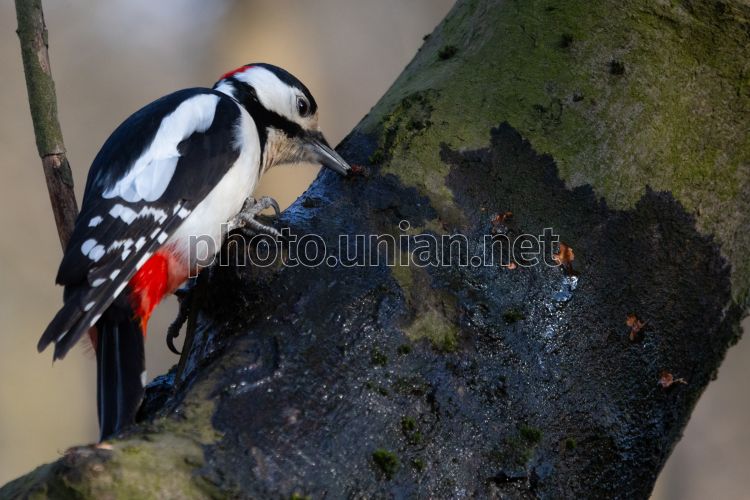 Дятел пьет сок дерева, в парке в Киеве, 17 марта 2026 г. Дятлы создают на стволе дерева так называемые «кольца» из мелких отверстий, из которых вытекает сок. Питание соком наиболее активно весной. Сок обеспечивает птиц питательными веществами. Фото УНИАН