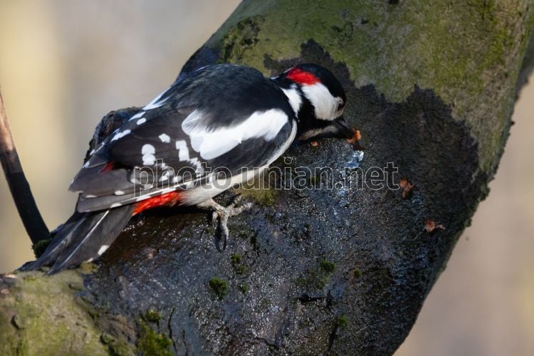 Дятел пьет сок дерева, в парке в Киеве, 17 марта 2026 г. Дятлы создают на стволе дерева так называемые «кольца» из мелких отверстий, из которых вытекает сок. Питание соком наиболее активно весной. Сок обеспечивает птиц питательными веществами. Фото УНИАН